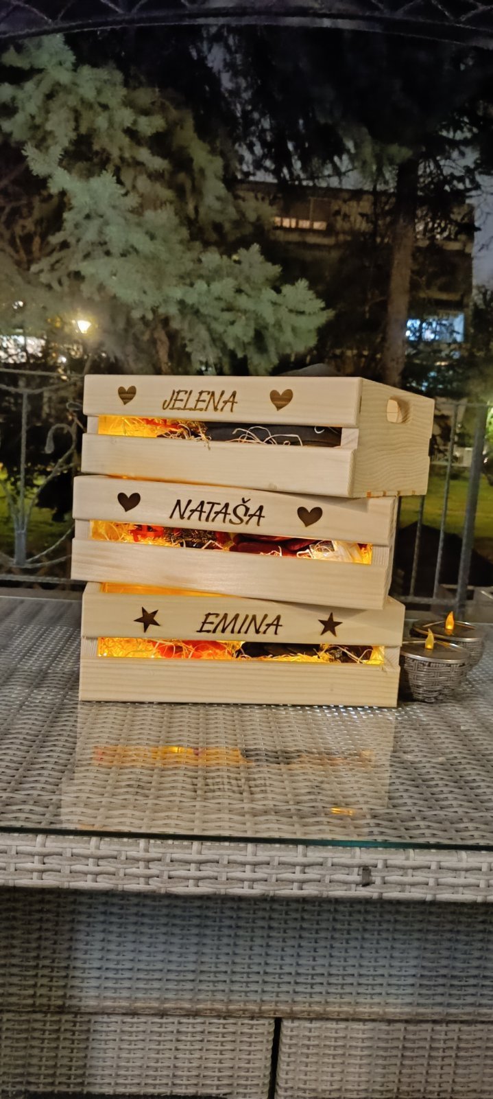 Svaka gajbica je unikatna, sa mogućnošću personalizacije prema vašim željama. Dimenzija gajbice je 38x25x12cm.